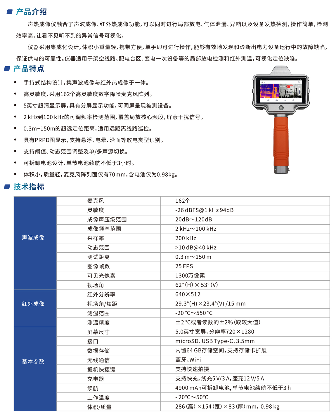 聲熱成像儀融合了聲波成像、紅外熱成像功能,可以同時進行局部放電、氣體泄漏、異響以及設備發熱檢測,操作簡單,檢測 效率高,讓看不見聽不到的異常信號可視化。 儀器采用集成化設計,體積小重量輕,攜帶方便,單手即可進行操作,能夠有效地發現和診斷出電力設備運行中的故障缺陷, 保證供電的可靠性。儀器適用于架空線路、配電臺區、變電一次設備等的局部放電檢測和紅外測溫,可視化定位缺陷。